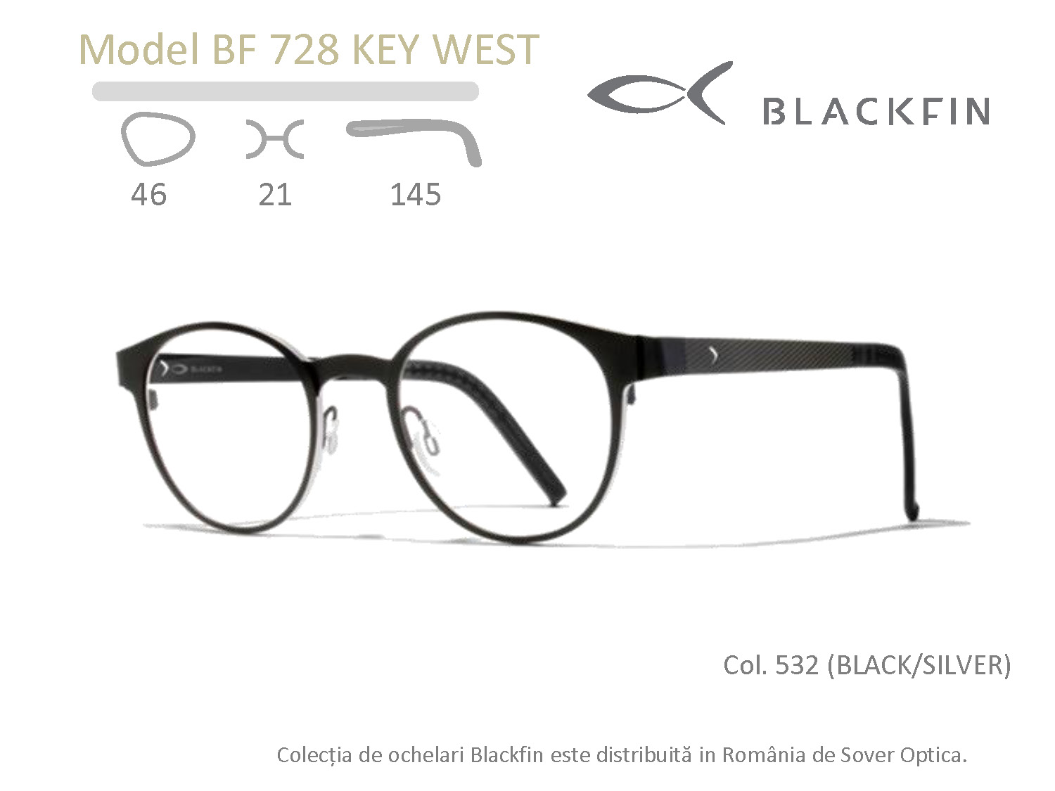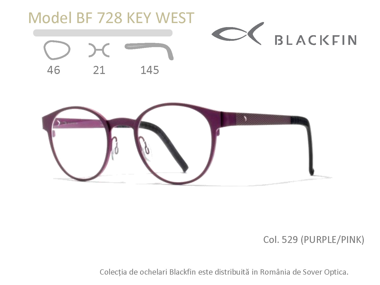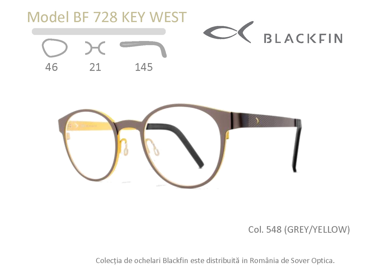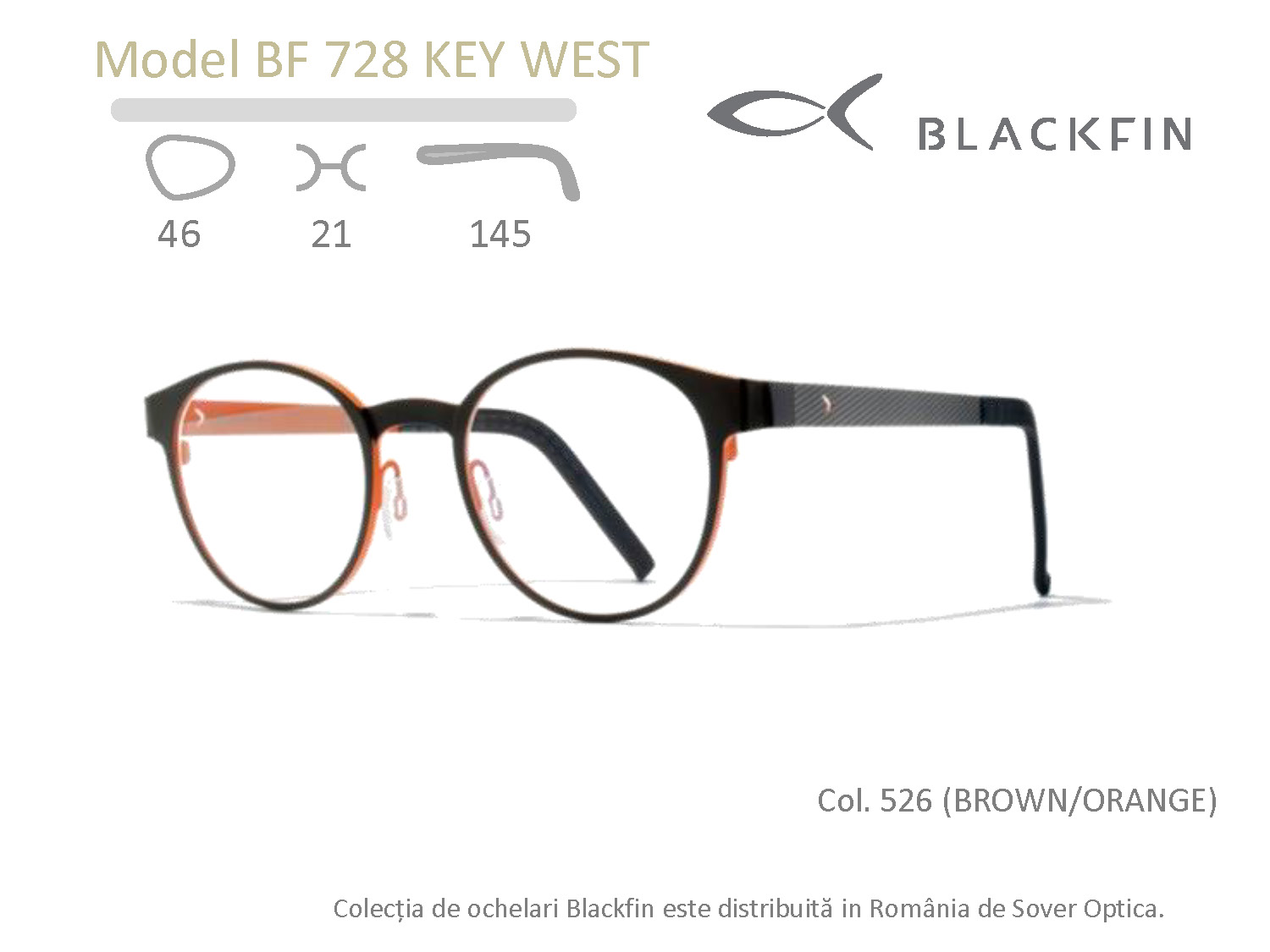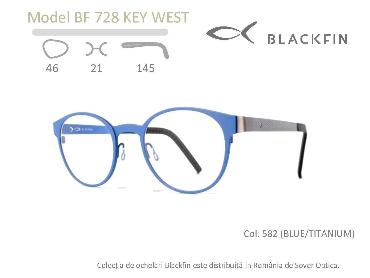 Cele opt versiuni cromatice a ramelor de ochelari Blackfin BF728 Key West se disting prin expresivitate formală, perfecțiunea detaliilor și exuberanța cromatică, confirmând energia și vitalitatea specifice Blackfin.