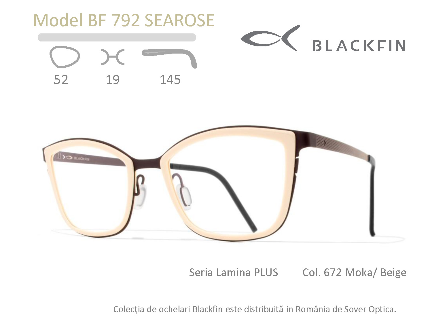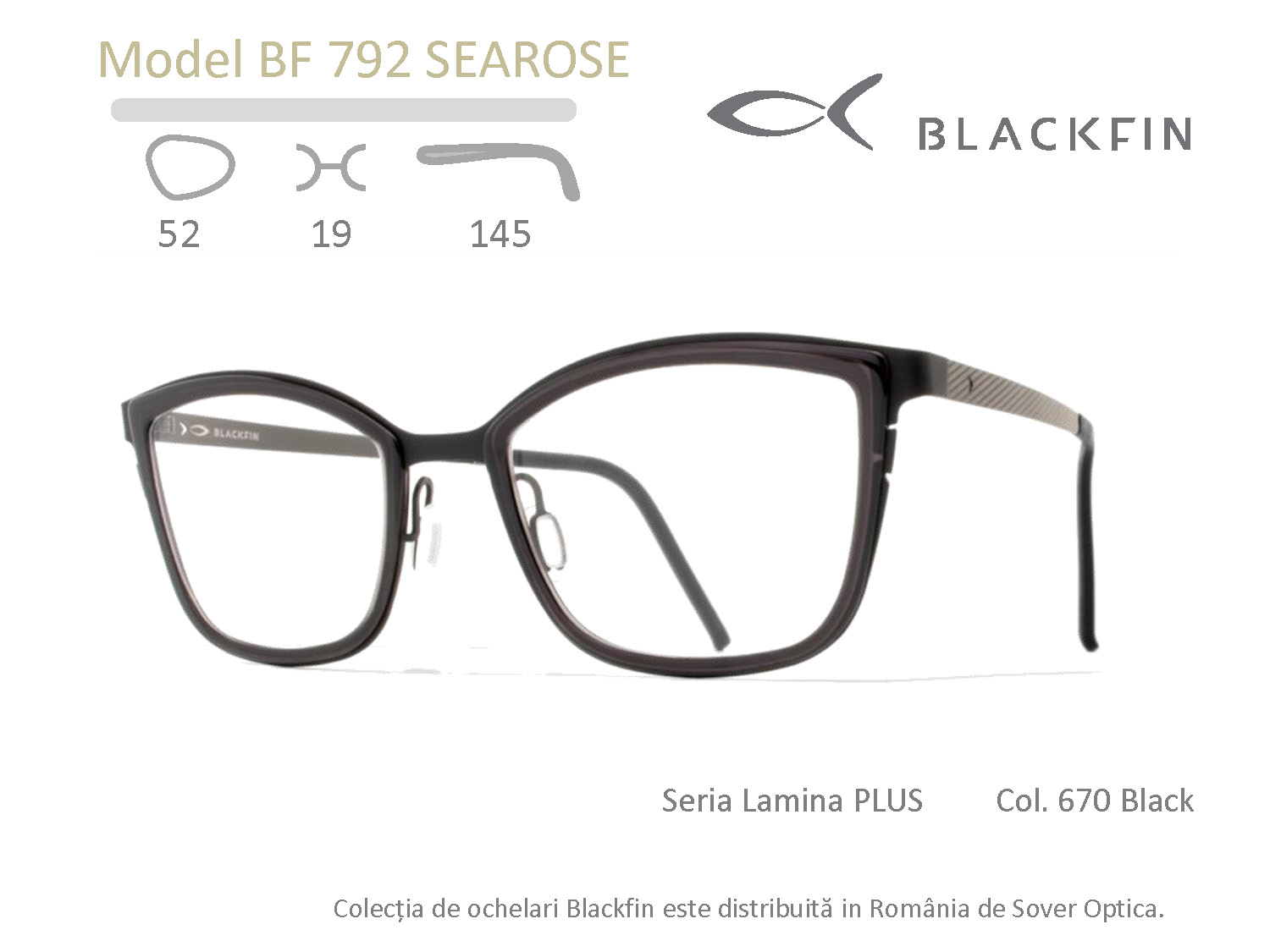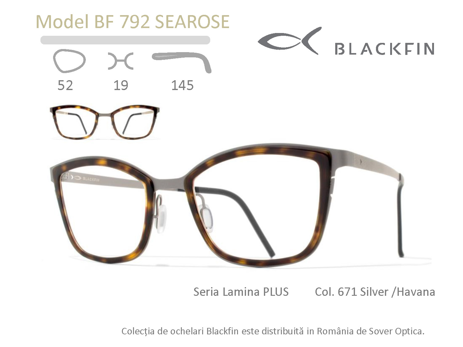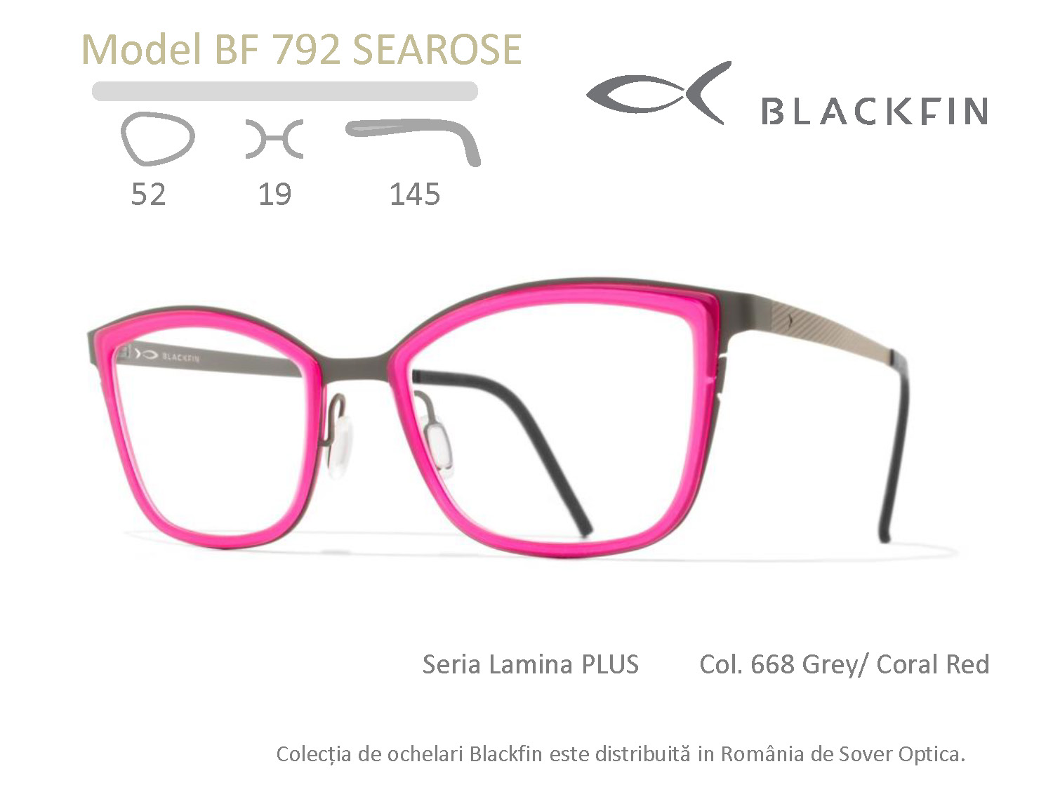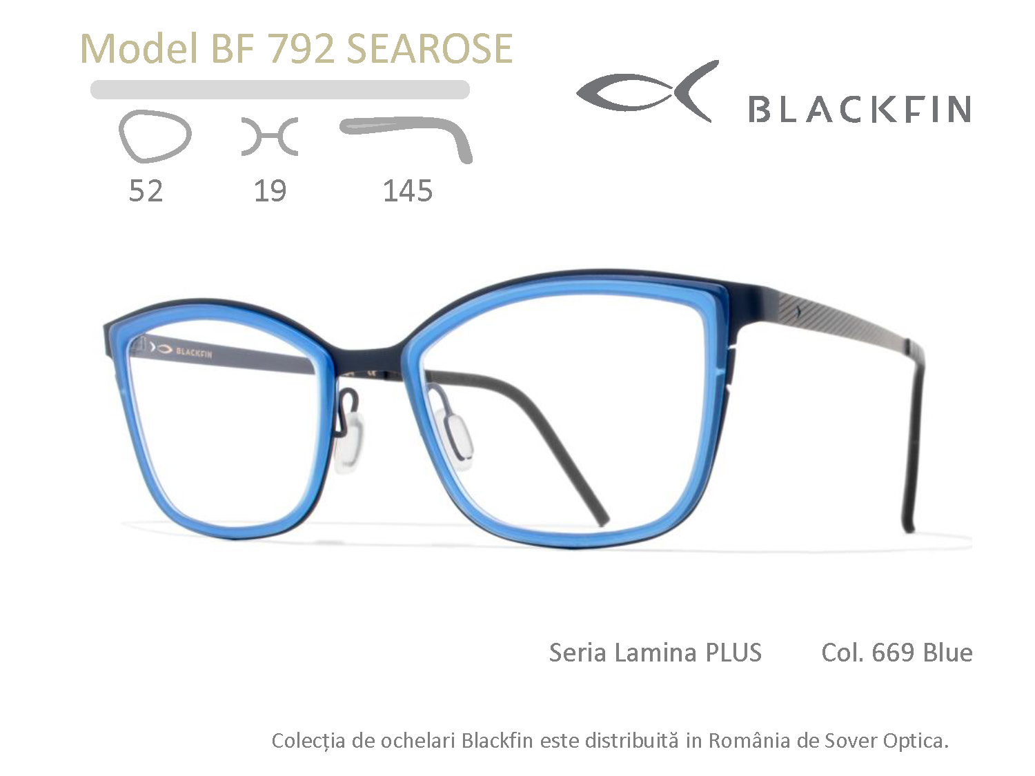 Montura Blackfin BF792 Searose aparține liniei Lamina Plus, o colecție lansată în februarie 2017. Blackfin propune un nou mod de abordare a monturii adresat purtătorilor atrași de contrastele dintre texturi: frontal confecționat dintr-un mix de materiale: beta-titan și acetat de celuloză. Manufacturate integral în Italia, modelele din colecția Lamina Plus utilizează acetat de înaltă calitate, secțiunea delicată a inelelor inserate în anourile structurii din beta-titan conferindu-le o expresie coerentă cu întreaga familie Blackfin.
