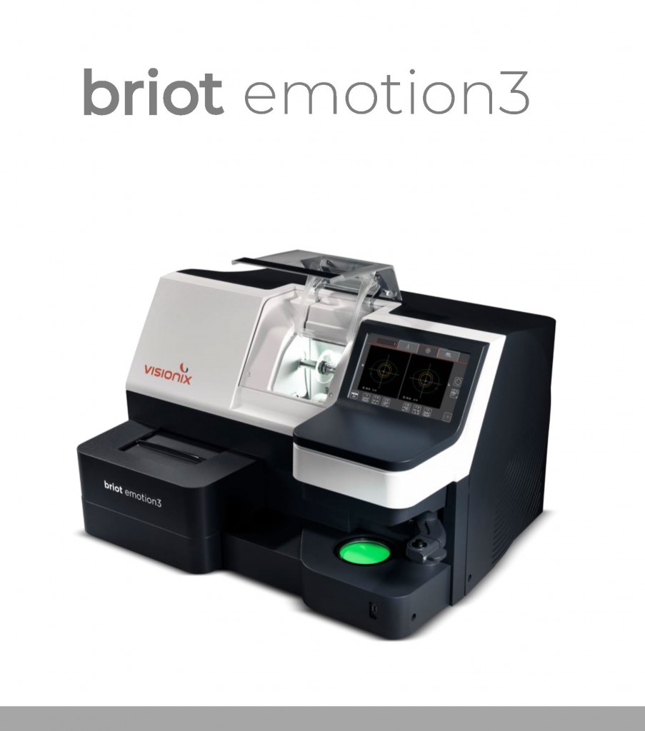 Mașina de șlefuit Briot eMOTION 3 este concepută și fabricată de Visionix, un grup internaţional specializat în furnizarea de aparatură destinată echipării cabinetelor oftalmologice şi atelierelor de optică.