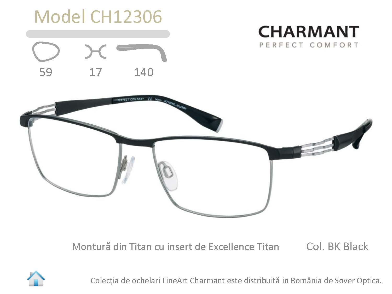 Făcând apel la titan pur pentru frontal și brațe, CH12306 pune în primplan expertiza grupului Charmant în privința aliajelor de titan, propunând o soluție tehnică inovativă pentru asigurarea flexibilității monturii. Insertul unui așa-zis “aditiv elastic” realizat din Excellence Titan constituie o rezolvare inteligentă, asigurând monturii atât elesticitatea necesară în zona articulației, cât și stabilitatea generală necesară purtării îndelungate.