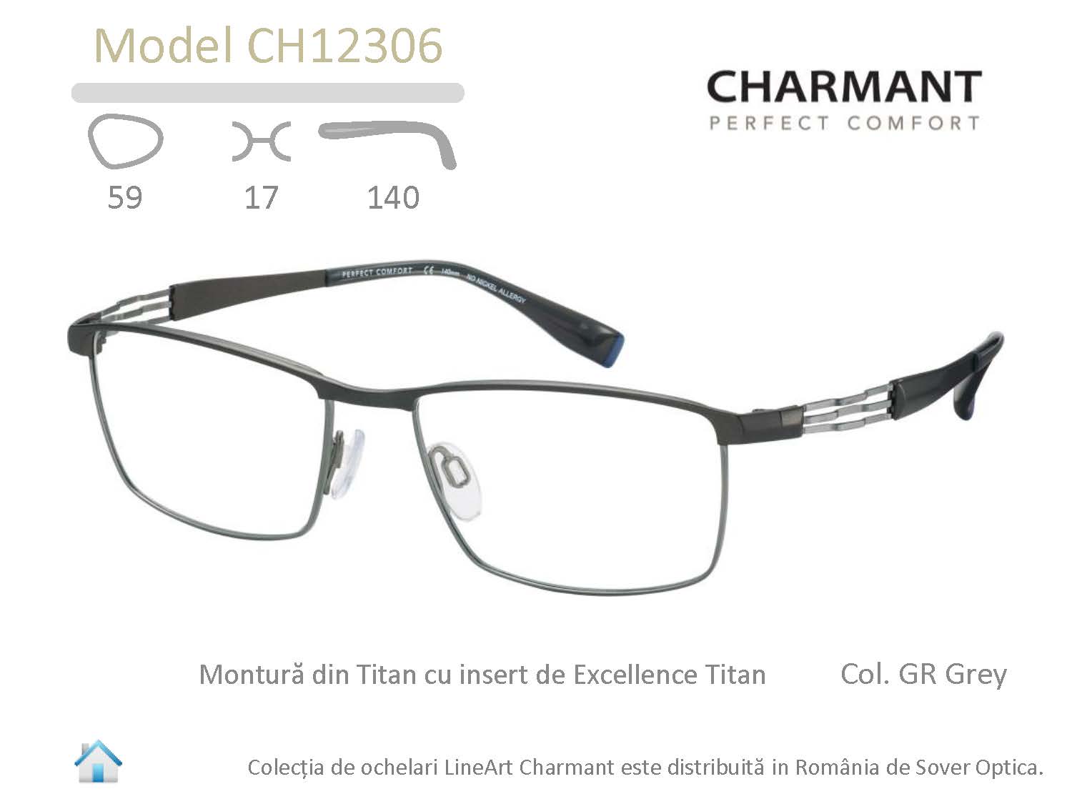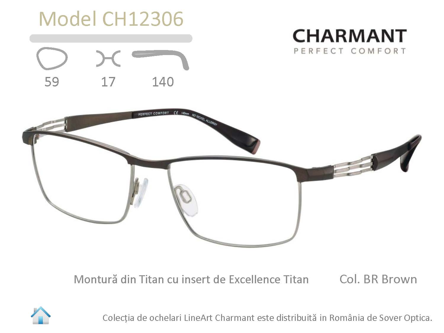 Adresată bărbaților presbiți, montura CH12306 se remarcă printr-un aspect bine proporționat, brațele și accentele cromatice susținând caracterul casual, adecvat purtătorilor interesați de funcționalitate în detrimentul modei. Cele două tonalități contrastante de culoare sunt integrate subtil în compoziția riguroasă a monturii.