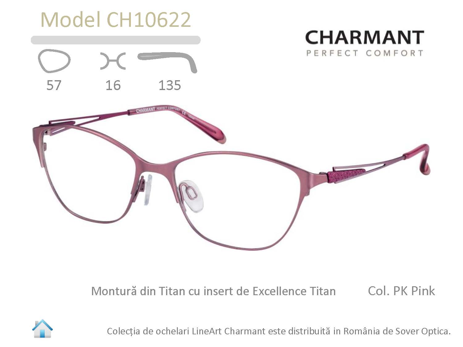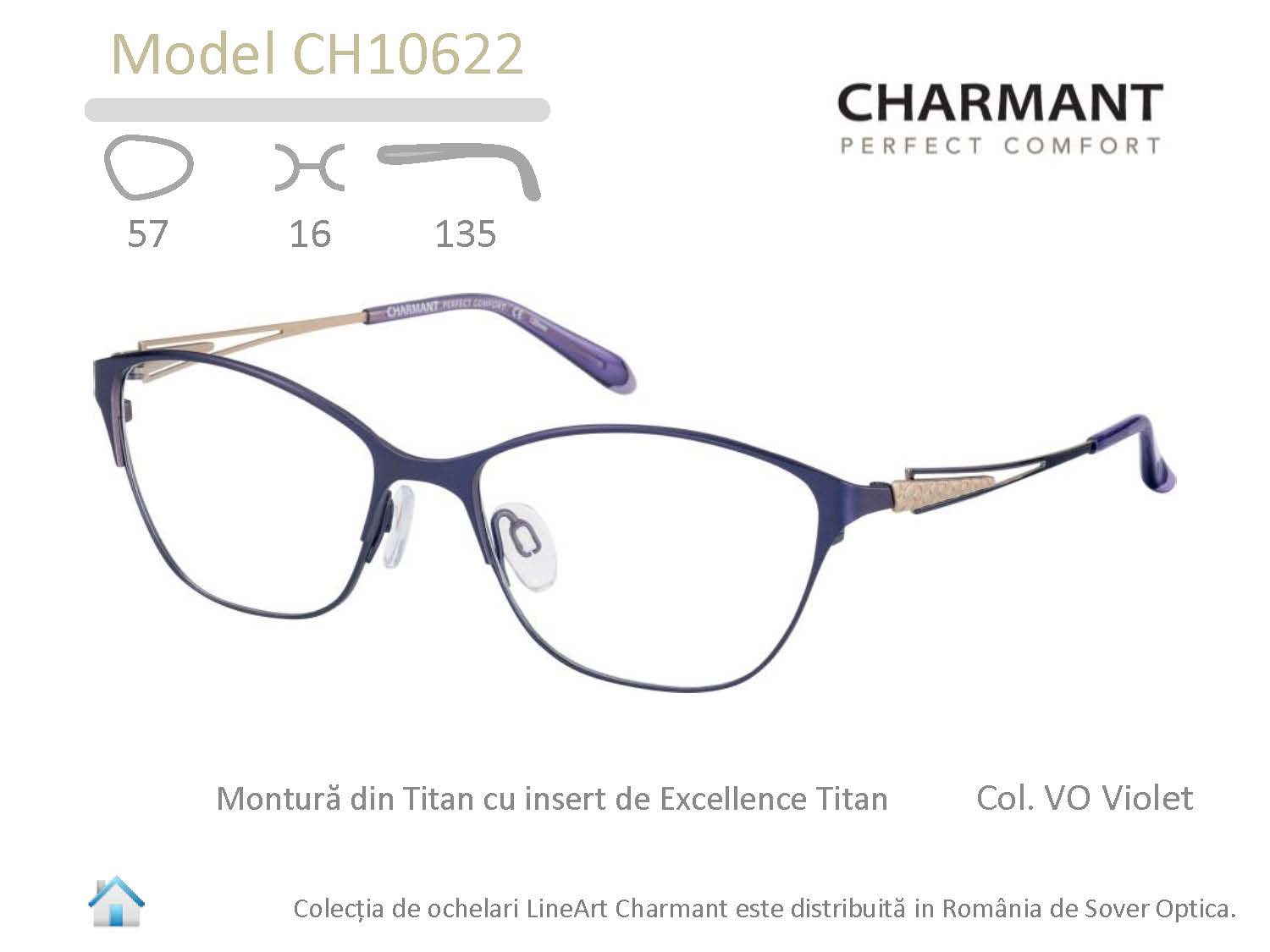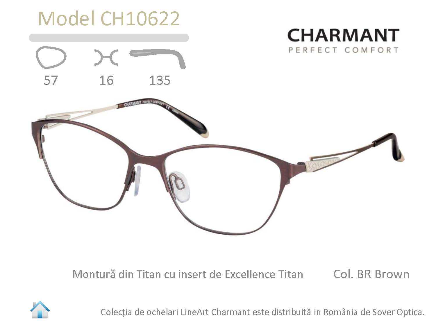 Făcând apel la titan pur pentru frontal și brațe, CH10622 pune în primplan expertiza grupului Charmant în privința aliajelor de titan, propunând o soluție tehnică inovativă pentru asigurarea flexibilității monturii. Insertul unui așa-zis “aditiv elastic” realizat din Excellence Titan constituie o rezolvare inteligentă, asigurând monturii atât elesticitatea necesară în zona articulației, cât și stabilitatea generală necesară purtării îndelungate.