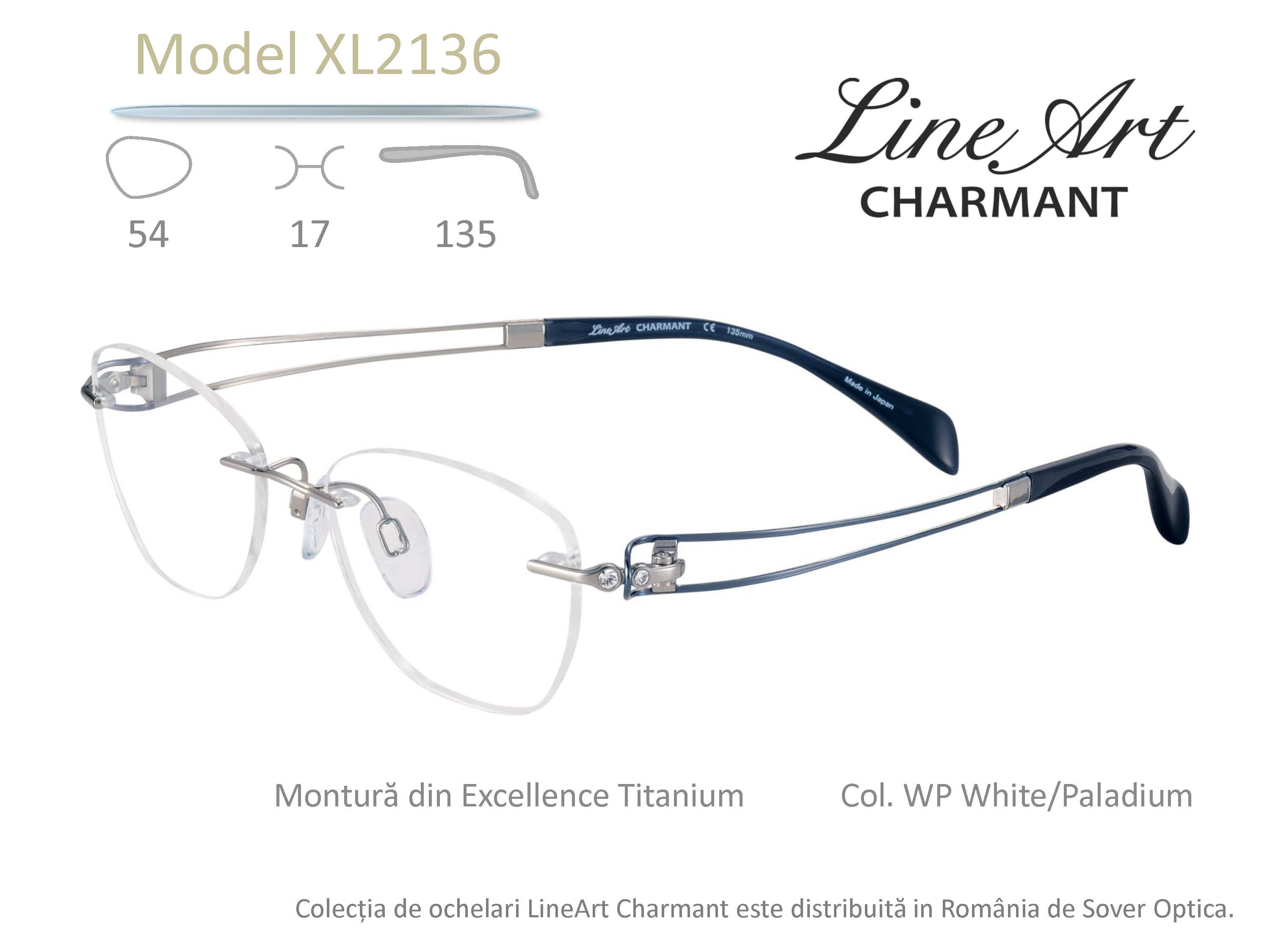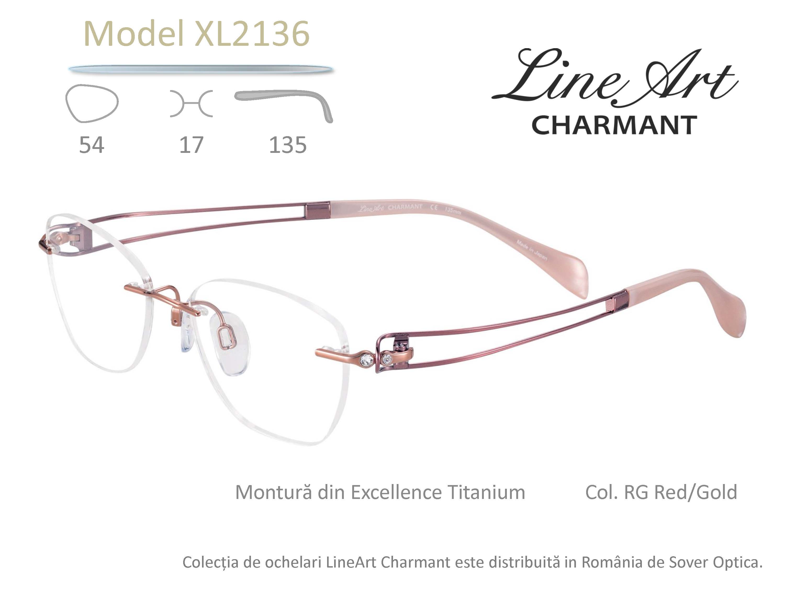 Modelul LineArt Charmant XL2136 aparține seriei Vivace, distingându-se prin silueta extrem de rafinată și delicată. Inexistența anourilor permite insertul oricăror corecții optice, montura având adresabilitate în segmentul femeilor cu vârste cuprinse între 30 și 55 de ani. Pentru aceste purtătoare, percepția vizuală optimă în condiții de confort anatomic absolut nu exclude expresivitatea și aerul contemporan. Compoziția câștigă în prețiozitate datorită celor patru cristale Swarovski, dispuse două câte două în zona articulațiilor.