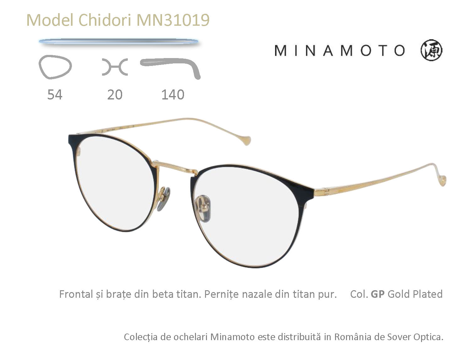 Integral confecționat din beta-titan, modelul pantos Chidori se remarcă prin anourile round texturate în contrast cu puntea nazală și brațele. La toate cele trei declinări coromatice, suprafețele anourilor sunt vernisate cu ajutorul tehnicii urushi, un procedeu japonez de lăcuire ce are o tradiție de peste 10.000 de ani. Din ansamblu nu lipsesc elementele consacrate ale vocabularului MINAMOTO – pernițele nazale din titan pur, gravurile fine dispuse ritmat ori kanji-ul Minamoto așezat pe capetele ambelor brațe.