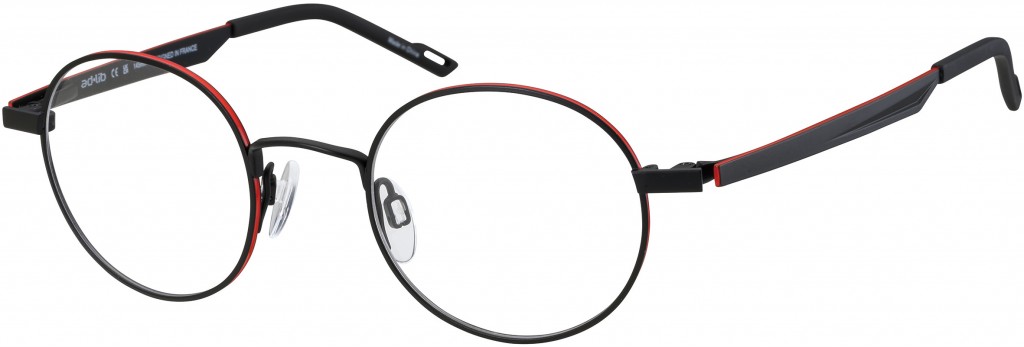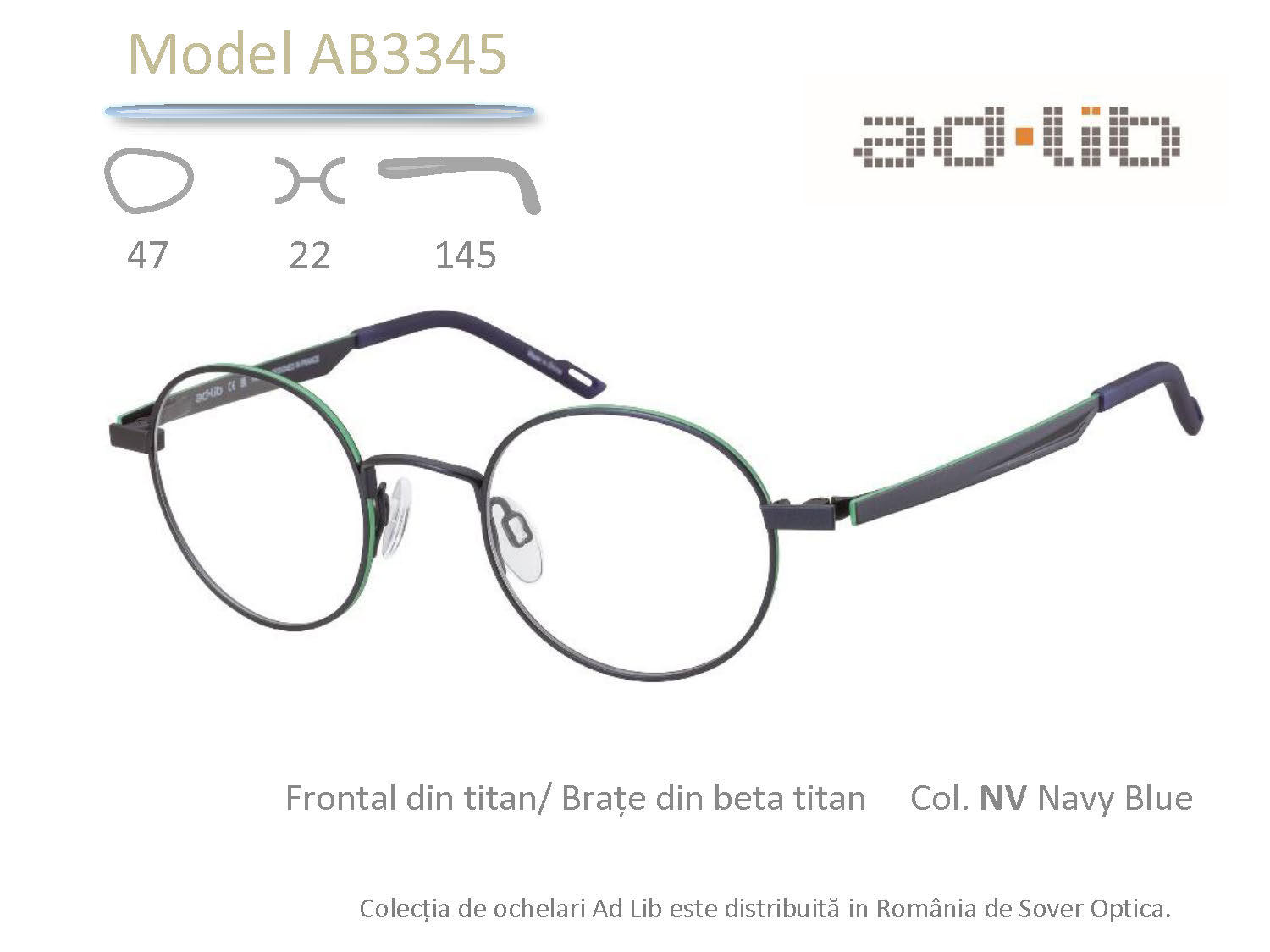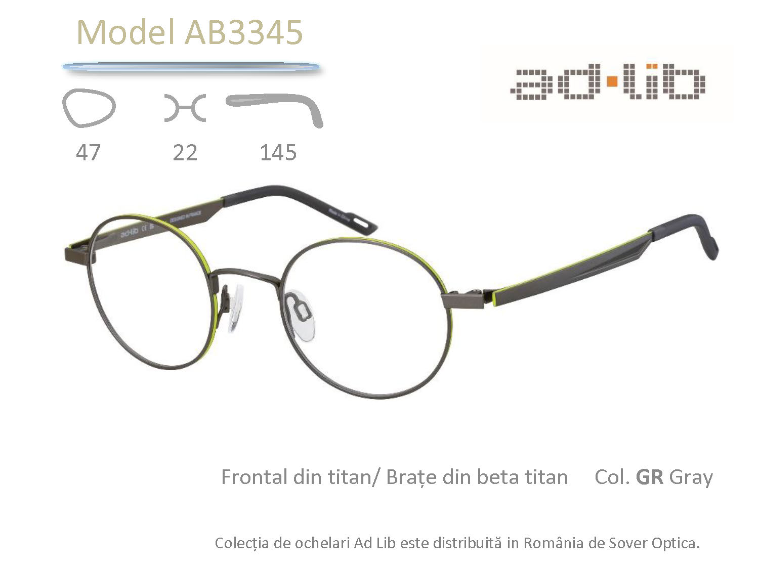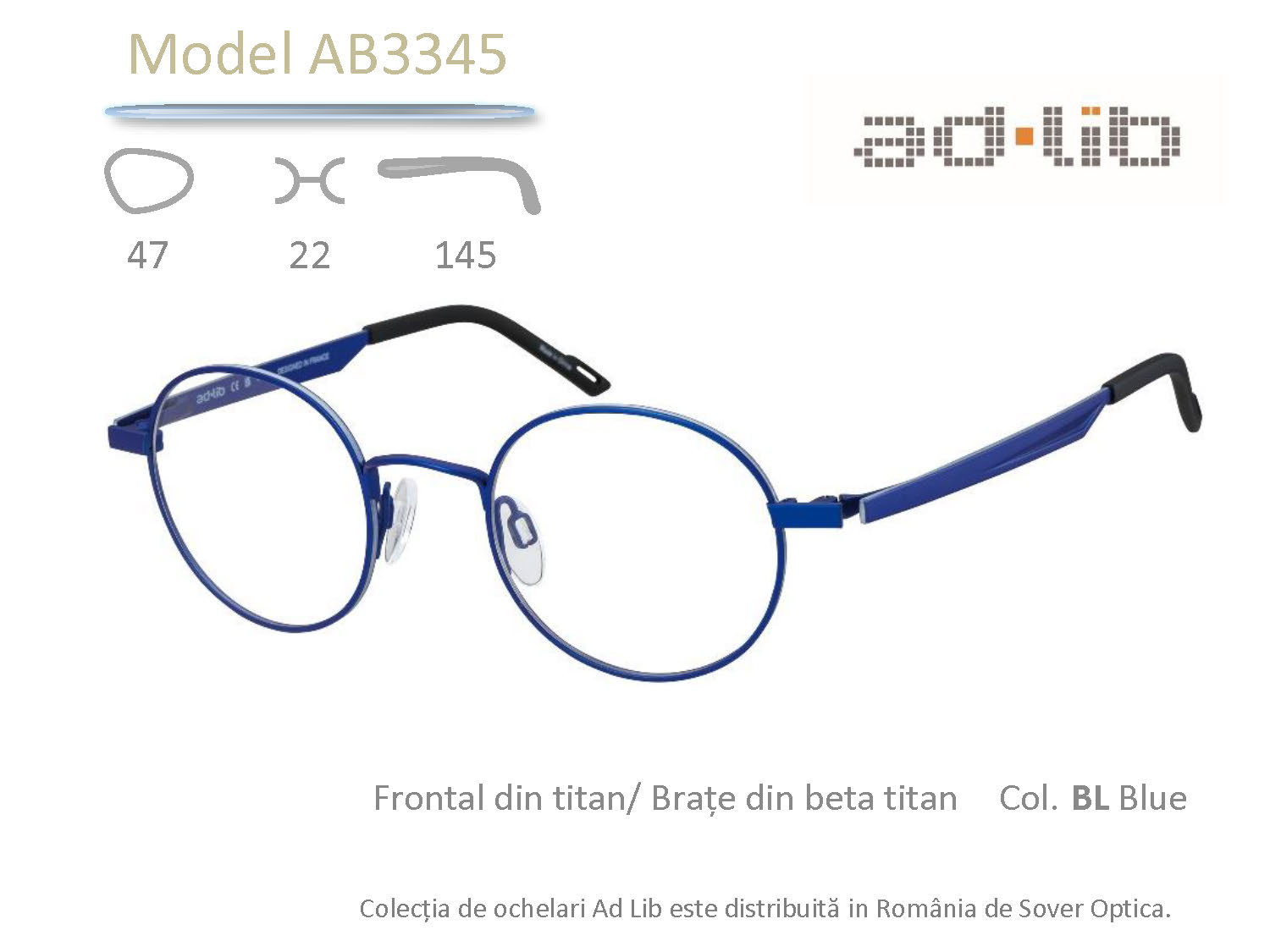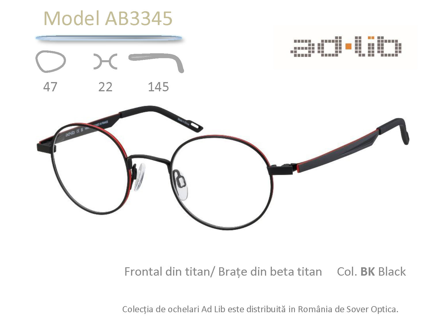 Montura unisex Ad Lib AB3345 aduce laolaltă clasicul și modernul. Clasicul frontal round e scena pe care sunt mixate jocuri cromatice. În versiunea AB3345_BK, culoarea dominantă este negrul, iar culoarea accent este roșul, acesta fiind prezent doar pe suprafețele orizontale ale ramei (pe muchiile anourilor sau pe cantul brațelor). Prezența dinamică a culorilor reprezintă un element identitar Ad Lib, o colecție de ochelari situată la intersecția dintre modă, tehnologie, sport și cultura pop.