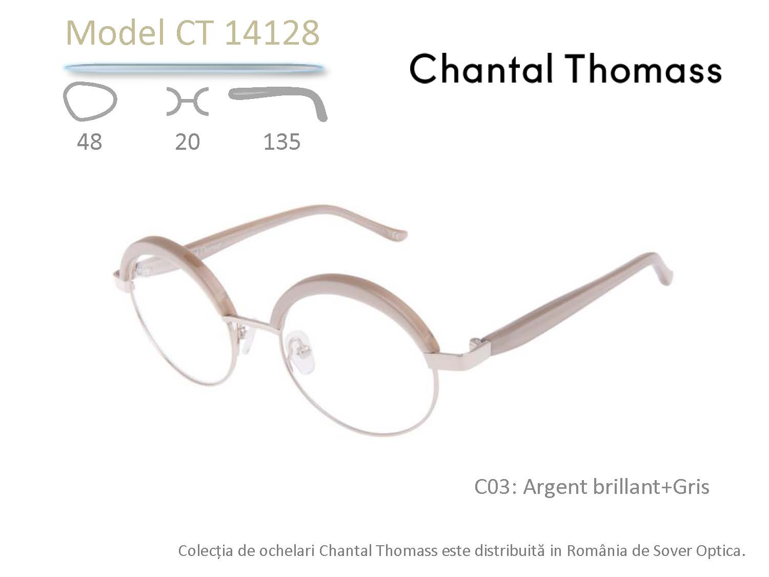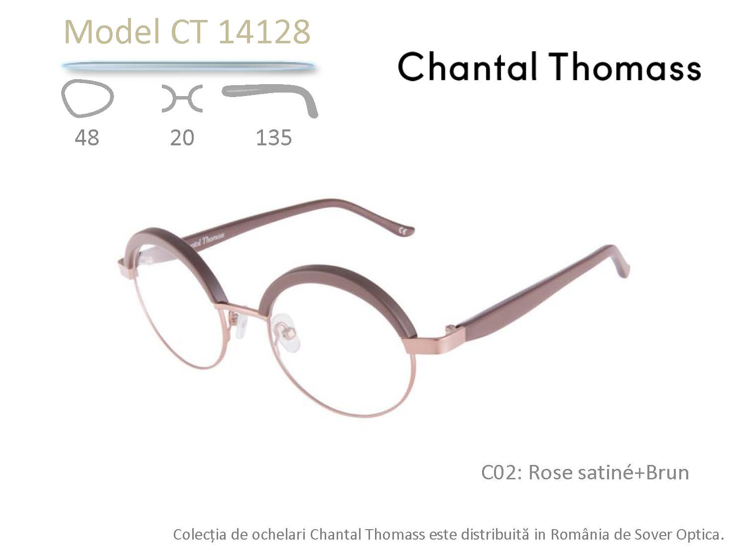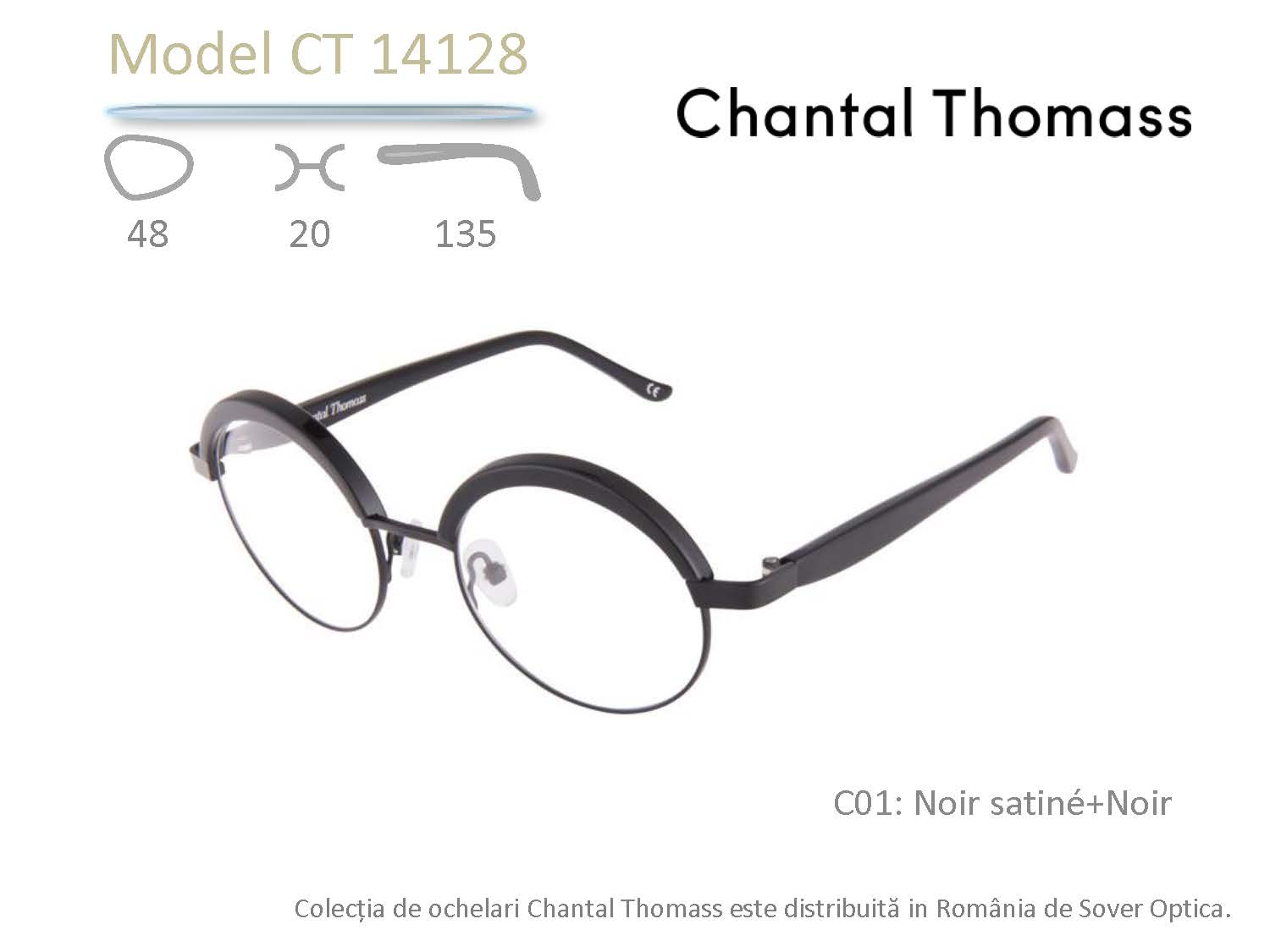 Modelul CT14128 are însă o conotație aparte, el aparținând unei colecții de ochelari dedicată femeilor chic, în care atmosfera pariziană include note de glamour și senzualitate. În viziunea Chantal Thomass -„I only design for women’s pleasure”- ochelarii round de culoare neagră devin un accesoriu fatal în compania unor personaje eliberate de inhibiții, ce fac cu ochiul impertinenței. În acest scenariu, ochelarii se fetișizează, devenind obiect al dorinței.