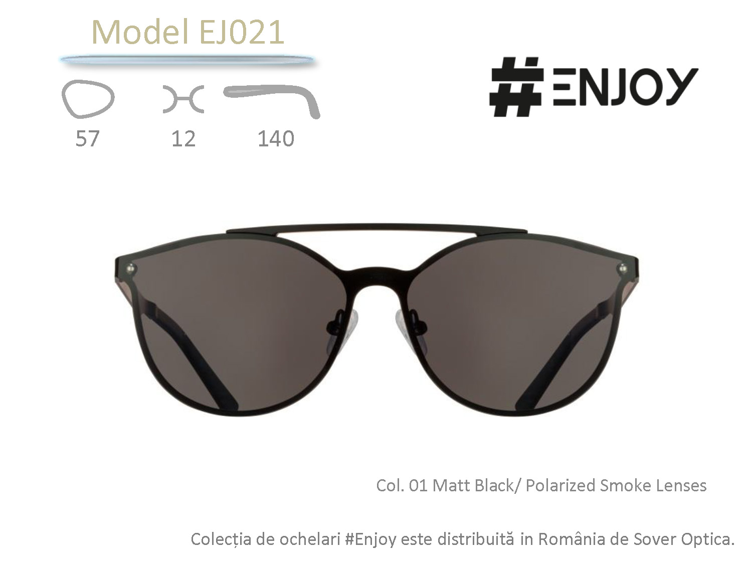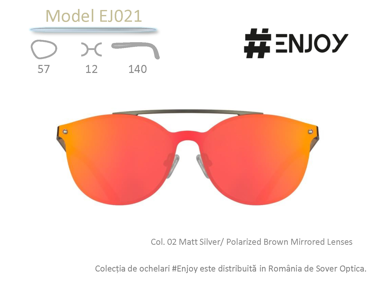 Ochelarii de soare #ENJOY EJ021 se remarcă prin silueta unică ce derivă din două formate iconice: clasica formă aviator și eternul round. Puntea dublă conferă rigiditate și stabilitate, în vreme ce anourile round proiectează imaginea unor ochelari atemporali, gata de drum în orice anotimp. Adresați generației Z, ochelarii #Enjoy EJ021 au avantajul de a fi îndrăgiți de ambele genuri, lentila unică din triacetat punând ochii la adăpostul unui sistem optic specific schiului alpin. Caracterul sportiv-urban constituie punctul forte al modelului, un atribut pus în valoare și prin forma relativ plată a lentilei.