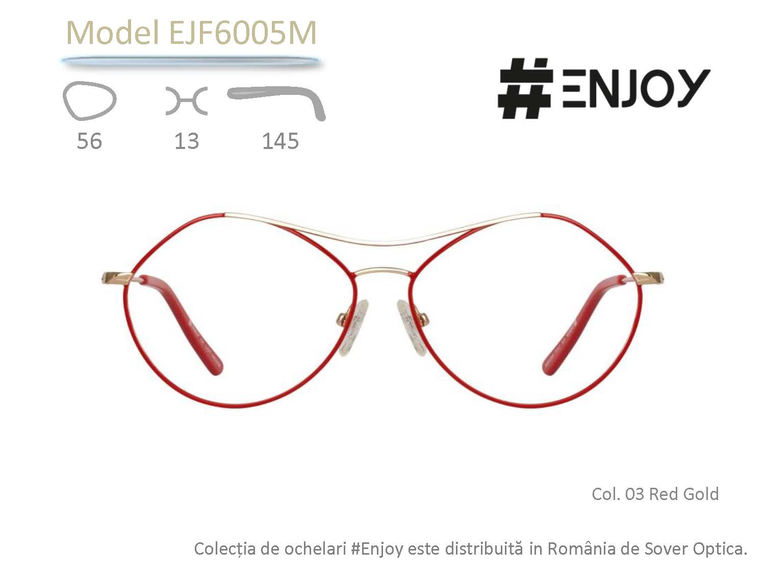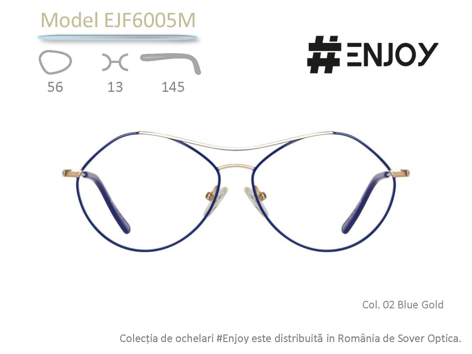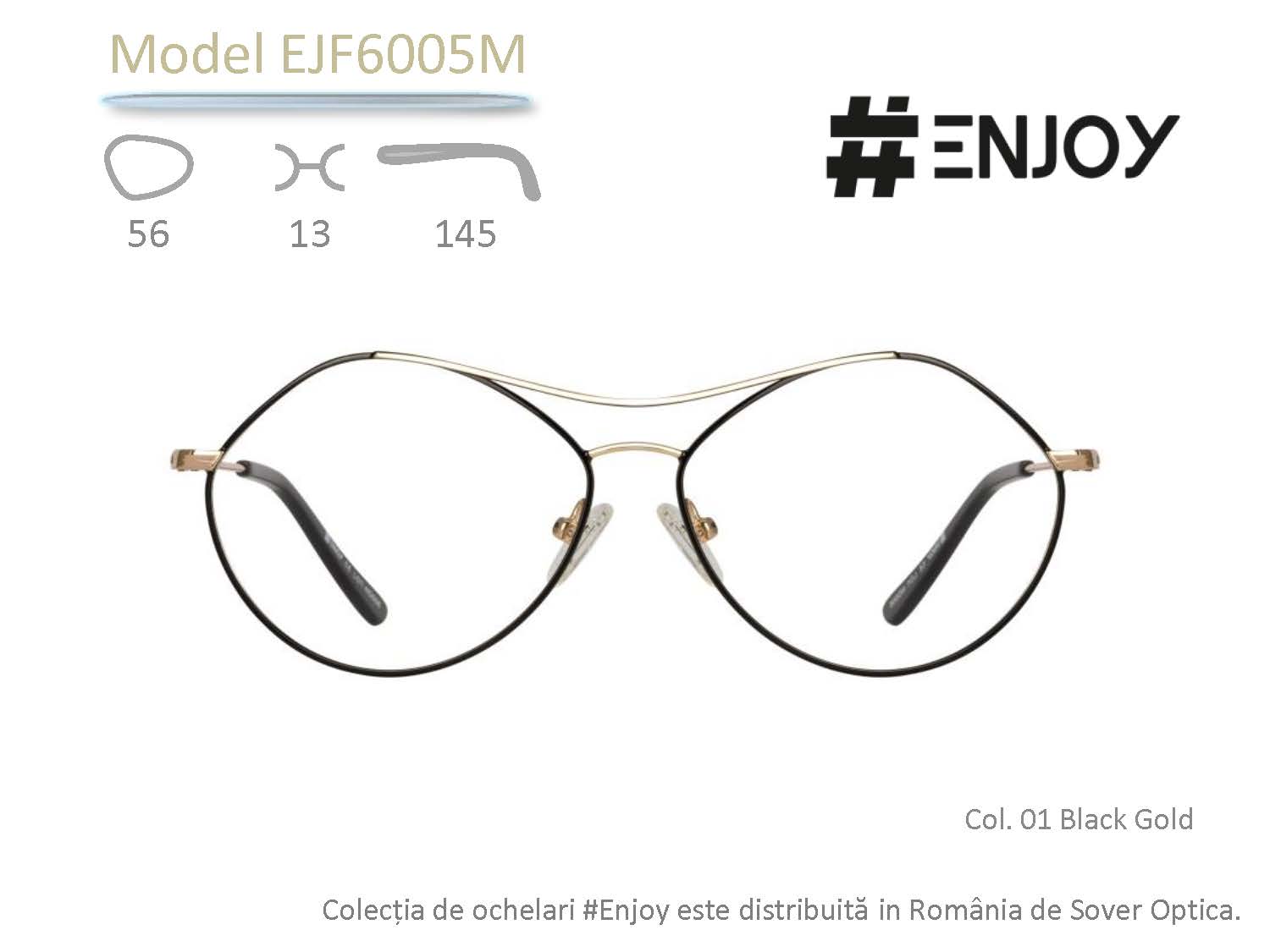 Rama de ochelari #ENJOY EJF6005M se remarcă prin silueta poligonală, inspirația derivând din reinterpretarea clasicilor ochelari aviator și round. Adresată tinerelor din generația Z, montura EJF6005M poate însoți atât o ținută casual, pe parcursul întregii zile, cât și un ansamblu elaborat, gândit pentru un eveniment special. Pe baza unei structuri aurii, designerii propun trei versiuni cromatice, capabile să evidențieze deopotrivă ochii și personalitatea milenialilor.