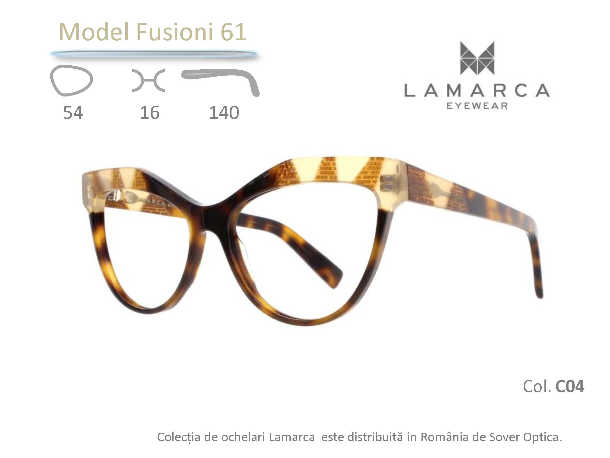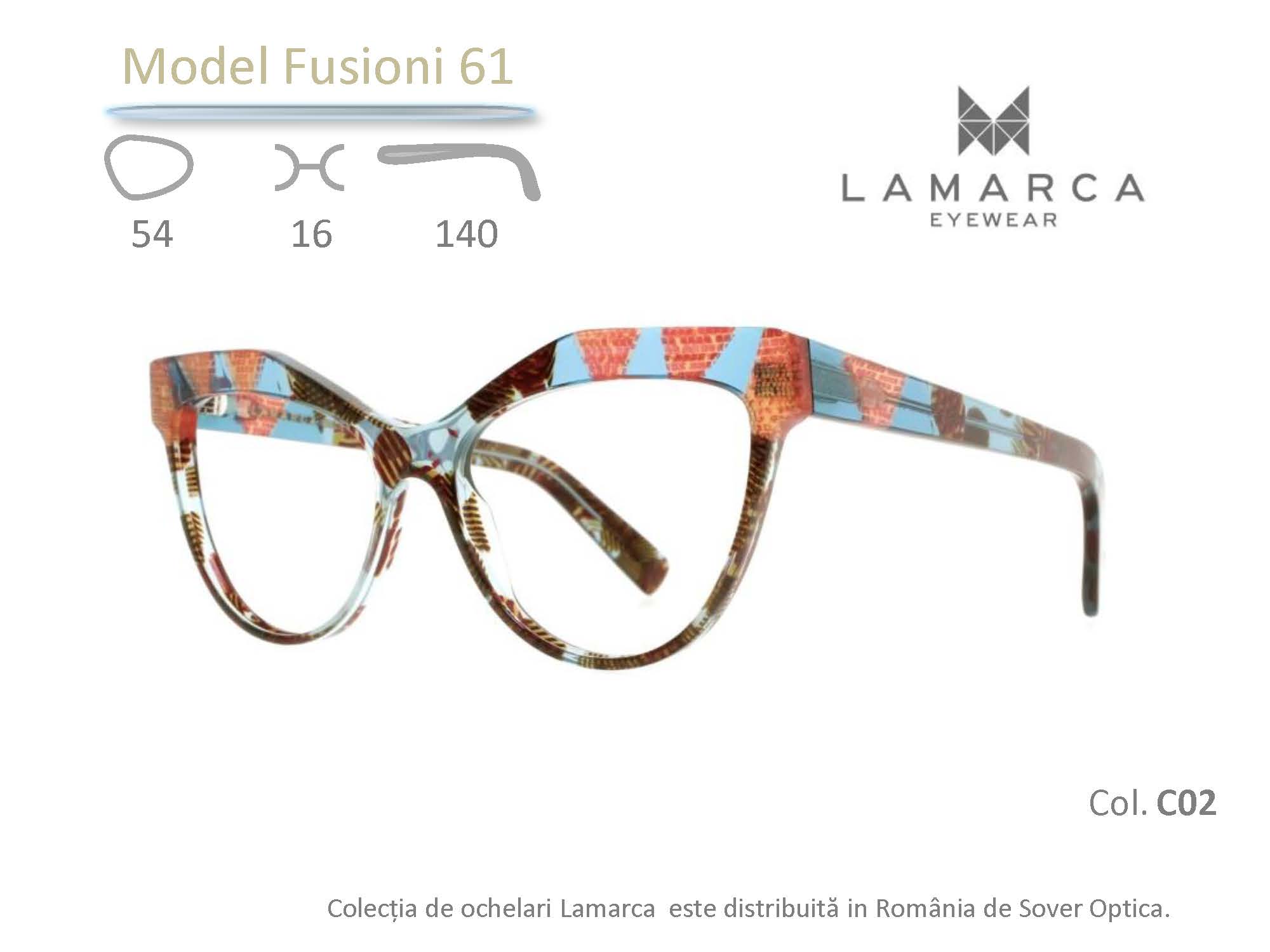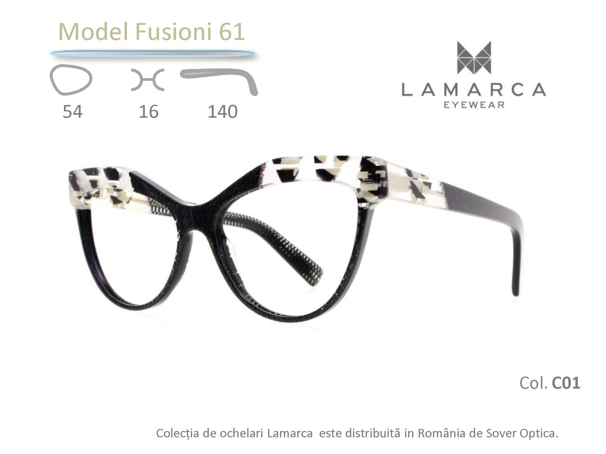 Paleta cromatică cuprinde 4 versiuni, pornind de la clasicul joc negru-gri-alb sidefat C01, trecând prin familiile oranj-havana (C02), alături de care sunt disponibile monturi în tonalități de albastru-havana (C03) și maro-havana (C04). Un atribut specific seriei Fusioni, precum și al multor modele Lamarca, îl constituie dificila descriere cromatică a modelelor. Sub titulatura Fusioni 61_C01, în zona temporală a frontalului, negrul se combină cu vibrații albe și este întrerupt de porțiuni transparente după o rețetă proprie acestui model.