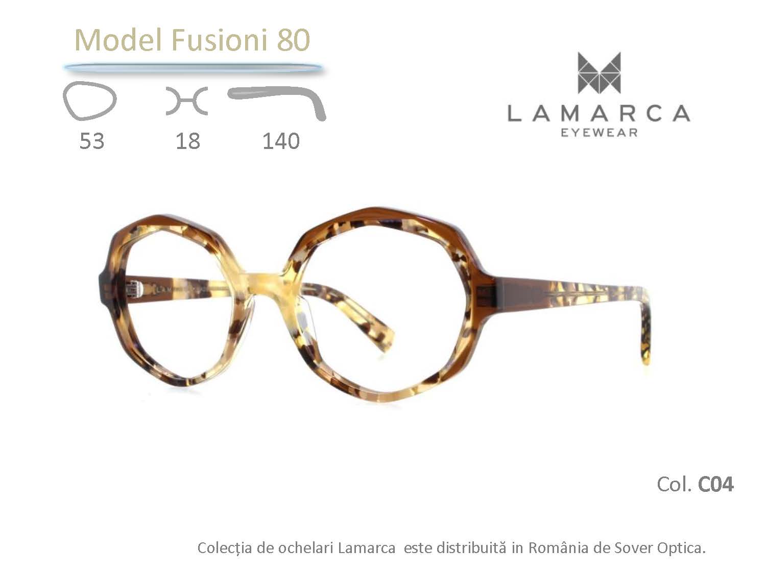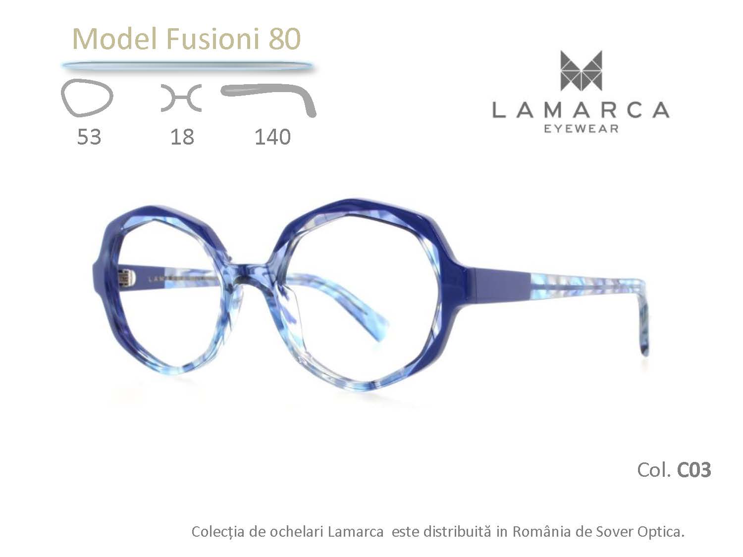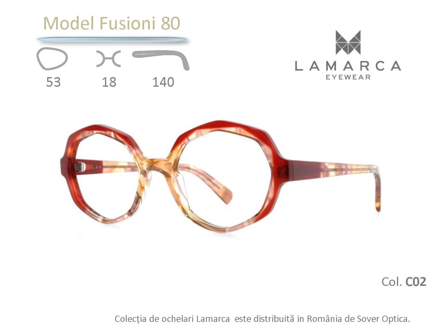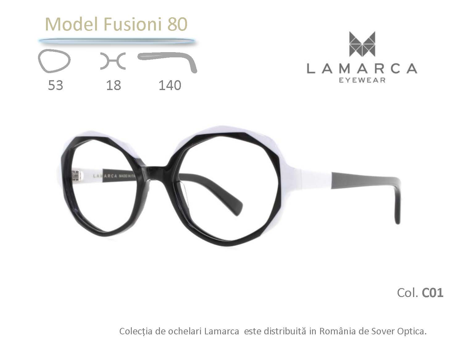 Paleta cromatică cuprinde 4 versiuni, pornind de la clasicul joc negru-gri-alb sidefat C01, trecând prin familiile oranj-havana, C02, alături de care sunt disponibile monturi în tonalități de albastru-havana C03 și bej-havana C04. Un atribut specific seriei Fusioni, precum și al multor modele Lamarca, îl constituie dificila descriere cromatică a modelelor. Fusioni 80_C01 evidențiază un joc savant al liniilor și culorilor – negrul se combină cu albul, fiind ritmat și încadrat în sectoare poligonale după o rețetă proprie acestui model.