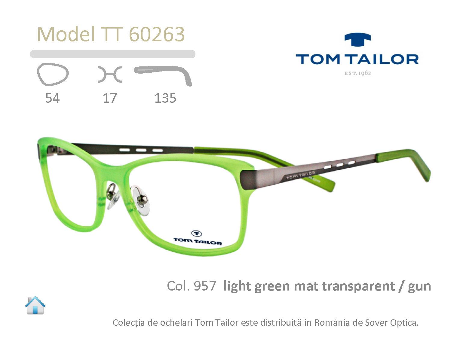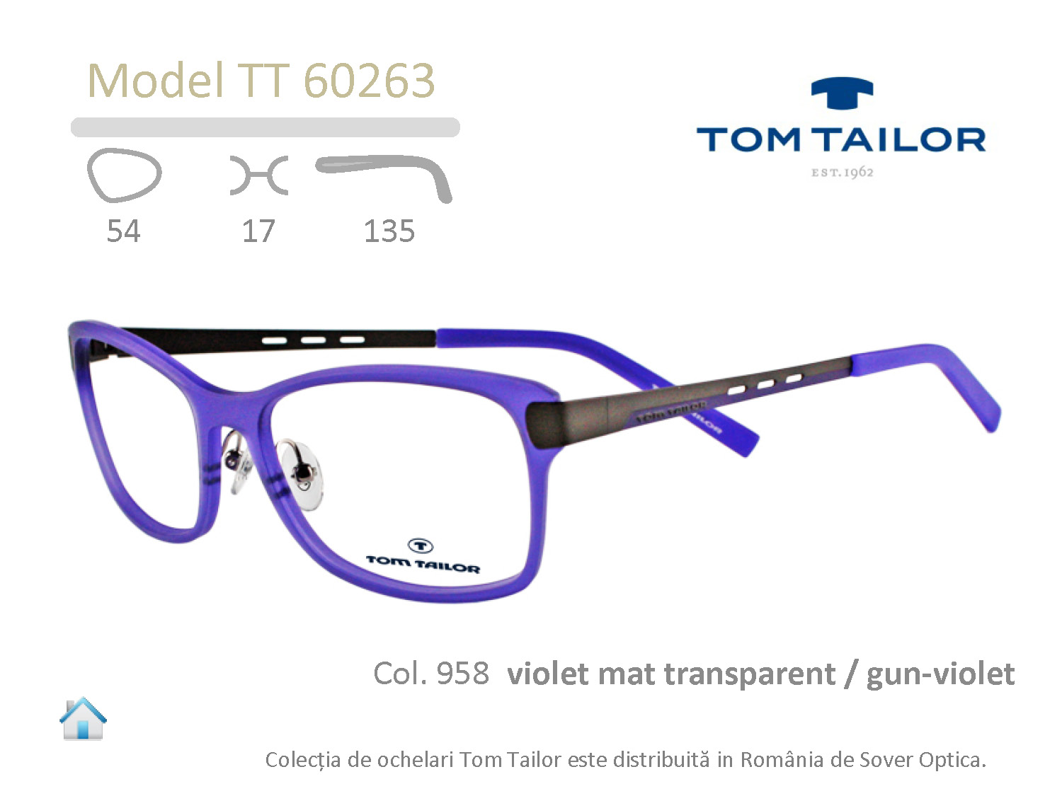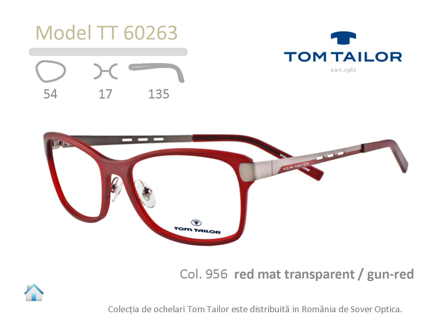 Galerie Tom Tailor TT60263 Caracteristici tehnice Latimea anoului: 54 mm Latimea puntii nazale: 17 mm Lungimea bratului: 135 mm